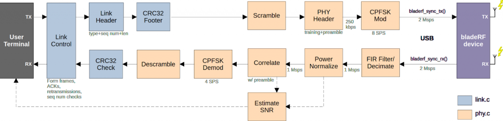 The code utilizes multi-threading with pthreads, allowing multiple operations to run in parallel. For example, the PHY receiver runs on its own thread constantly receiving samples and processing them; RX and TX are on separate threads so they never get in each other’s way. The TX and RX pipelines each have 3 threads running, representing user interface (bladeRF-fsk.c), link layer (link.h), and phy layer (phy.c).