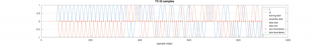 TX baseband IQ samples for PHY frame with payload message “hello”